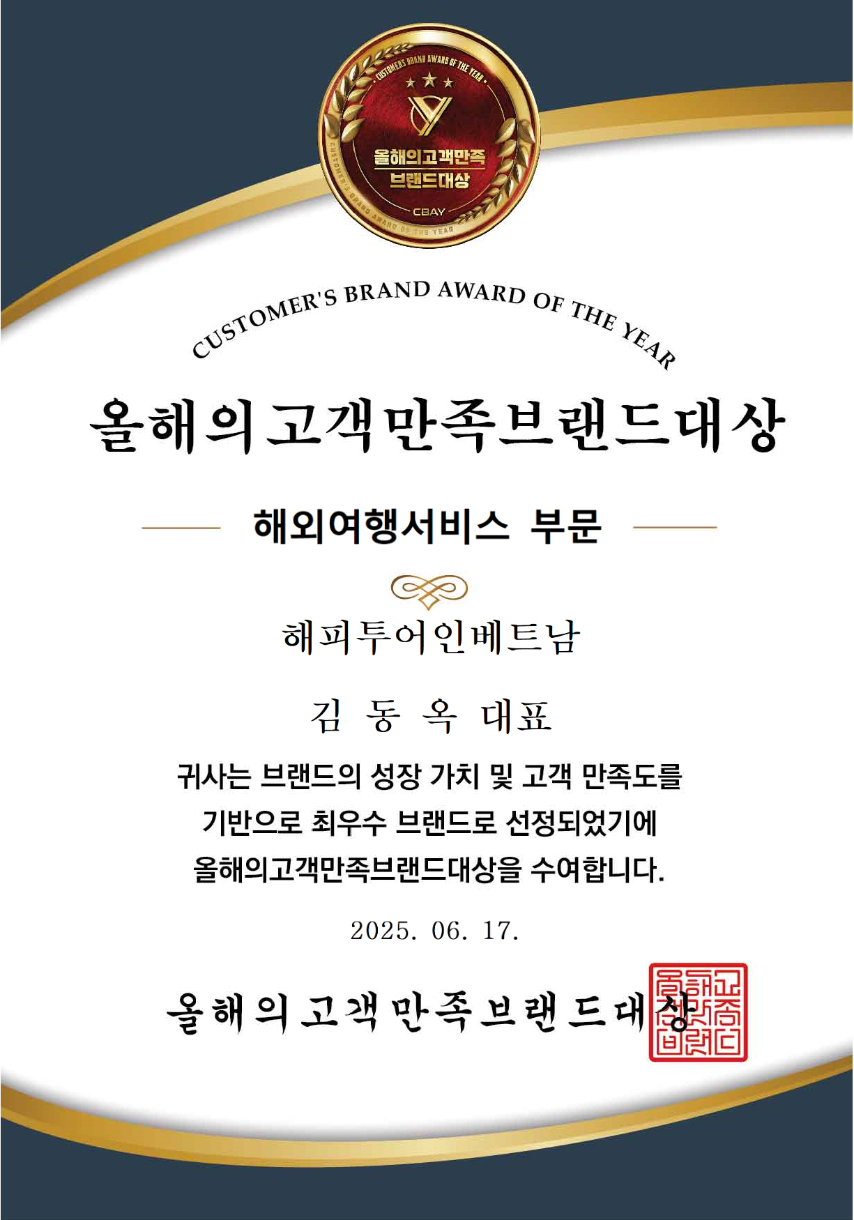 저희 해피투어 인 베트남이 2025 올해의 고객만족브랜드 대상 – 해외여행 서비스 부문 1위에 선정되었습니다!